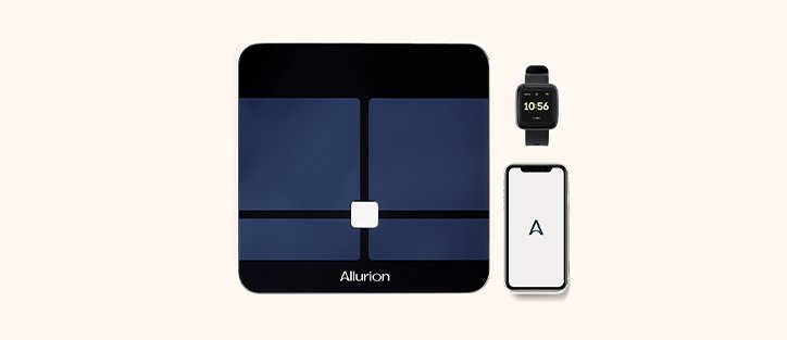 The Allurion Connected Scale and Health Tracker, connected to the Allurion Mobile App to track and support your achievements.